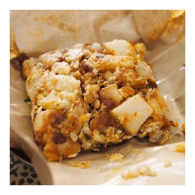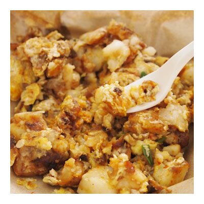 The savory carrot cake is made of steamed radish, also known as white carrot, which is tossed in a large wok with eggs, garlic and a variety of sauces. There are two versions of the carrot cake – a black and a white version. The black carrot cake adds a thick black soy sauce for some sweetness, while the white version is eggier and omits the black sauce. Chopped scallions are added to both versions and a side of chili sauce is included, upon request. Most Singaporeans have a preference for either the white or the black versions of the carrot cake. My personal favorite is the white carrot cake and one of the best versions can be found at the Ghim Moh Hawker Center.